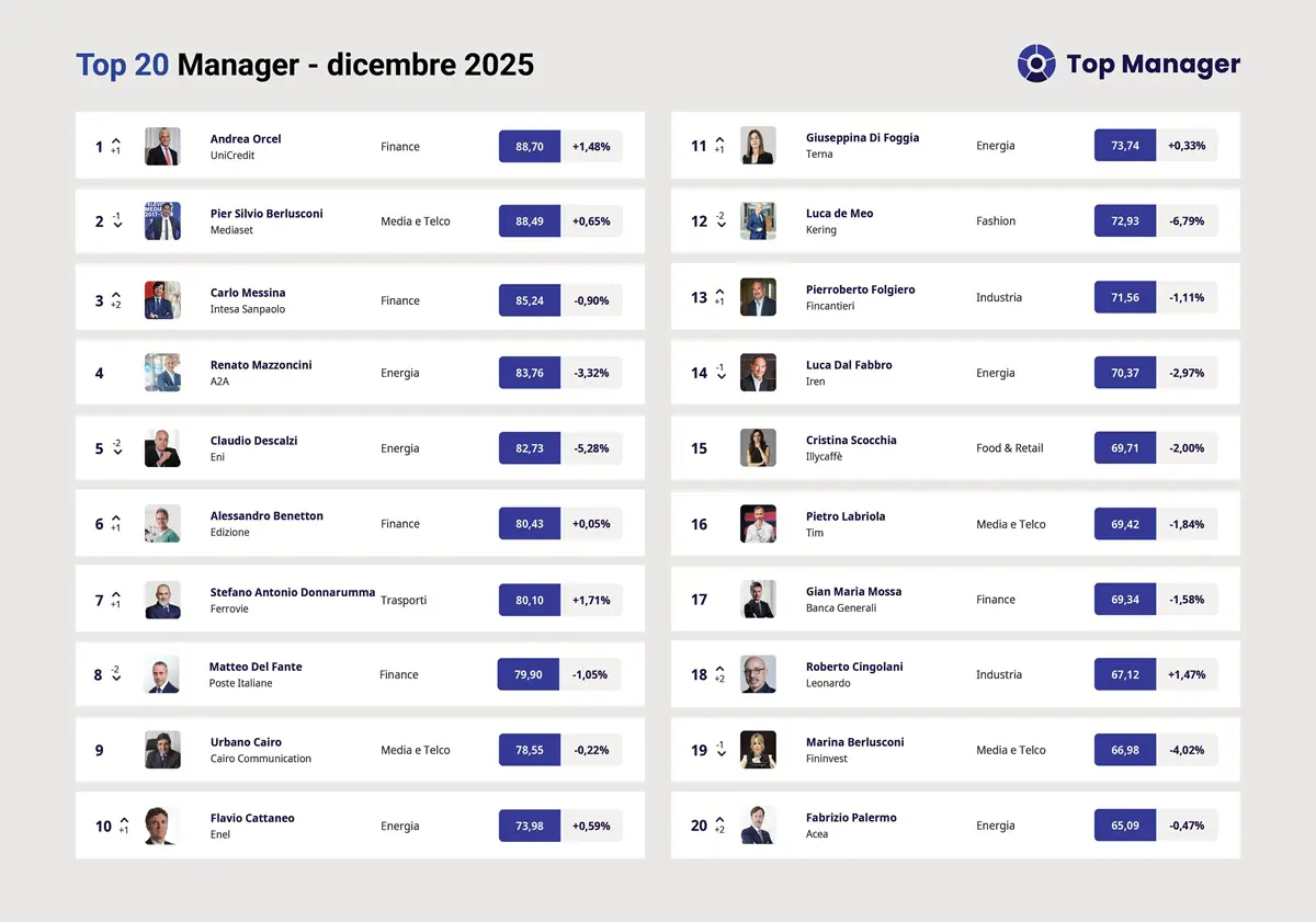 Andrea Orcel si riprende la vetta di Top Manager Reputation, sul podio Pier Silvio Berlusconi e Carlo MessinaDi / Gennaio 12, 2026