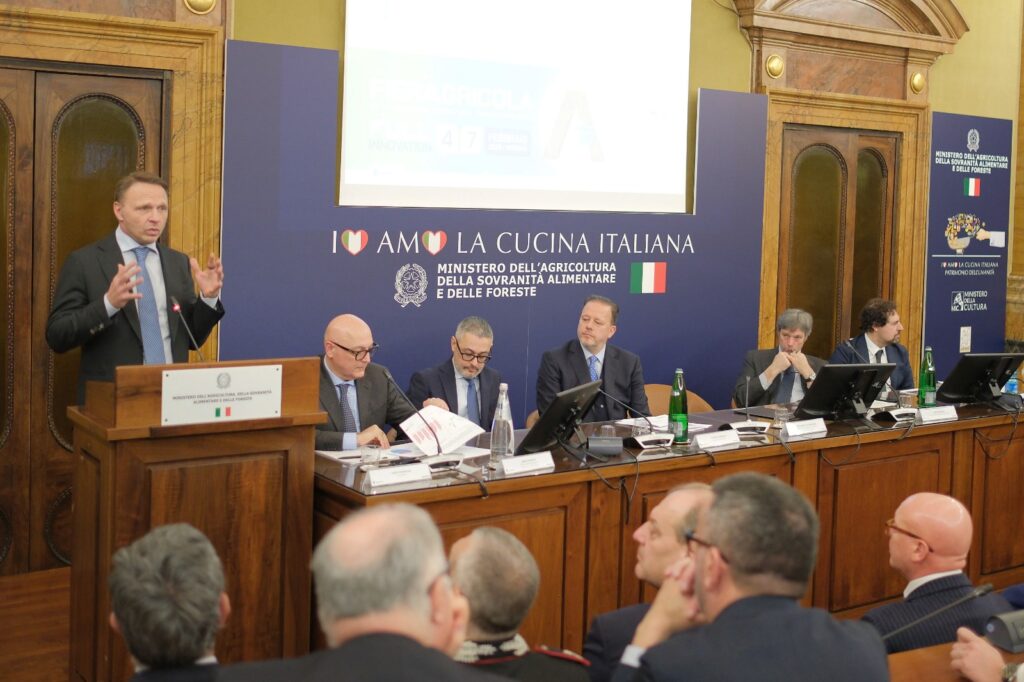 ROMA (ITALPRESS) – Con 816 espositori (tutti i top brand presenti), 136 convegni e workshop, 11 padiglioni occupati per 52.000 metri quadrati, oltre a 6.000 metri quadrati di aree destinate alle più importanti mostre zootecniche a livello nazionale ed europeo e ai “Dynamic Show”, buyer e operatori del settore già accreditati da 28 Paesi, la 117 Fieragricola, manifestazione internazionale di riferimento per l’agricoltura, dà appuntamento a Veronafiere dal 4 al 7 febbraio prossimi. L’edizione 2026 è stata presentata questa mattina a Roma, al ministero dell’Agricoltura, della Sovranità alimentare e delle Foreste. All’evento sono intervenuti Francesco Lollobrigida, ministro dell’Agricoltura, della Sovranità alimentare e delle Foreste, Federico Bricolo, presidente di Veronafiere, Matteo Zoppas, presidente di ITA-Italian Trade Agency, Matteo Pasinato, event manager di Fieragricola. Denis Pantini, responsabile Agrifood e Wine monitor di Nomisma, ha illustrato la ricerca commissionata da Fieragricola “Full innovation: l’agricoltura italiana tra realtà produttiva e consumatori”.