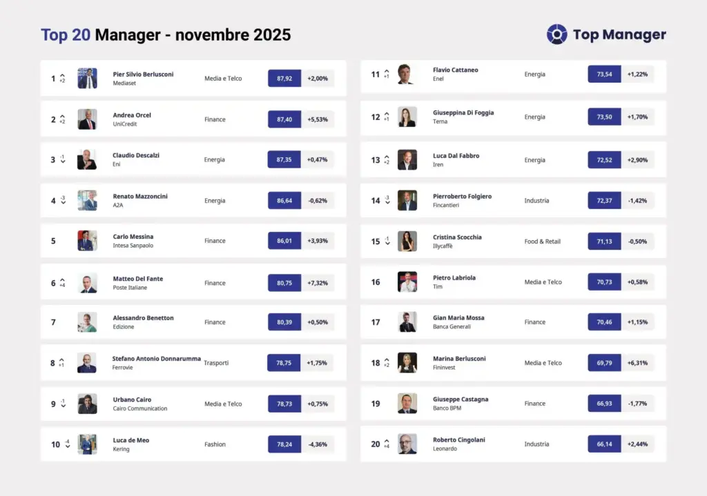 Al sesto sale di quattro l’AD di Poste Matteo Del Fante (80.75) che celebra con CDP e il Presidente Mattarella i 150 del risparmio postale e i 10 anni della quotazione in Borsa. Al settimo si conferma Alessandro Benetton (80.39), all’ottavo sale di uno l’AD di FS Stefano Donnarumma (78.75) che strategicamente guarda all’alta velocità in Germania. Urbano Cairo (78.73) e Luca de Meo (78.24) chiudono la top 10. All’undicesimo sale di uno Flavio Cattaneo (73.54) AD di Enel che segna il massimo storico in borsa, con un balzo del 50% dall’inizio del suo mandato nel 2023. Sale di uno anche l’AD di Terna Giuseppina Di Foggia (73.50) che chiude i nove mesi in crescita e con oltre 2 miliardi di investimenti. Al tredicesimo sale di due il Presidente di Iren Luca Dal Fabbro (72.52) con risultati in crescita e investimenti che superano il miliardo, la maggior parte dei quali sulla sostenibiltà. Seguono: Pierroberto Folgiero (72.37), Cristina Scocchia (71.13), Pietro Labriola (70.73) e Gian Maria Mossa (70.46). Al diciottesimo sale di due Marina Berlusconi (69.79), al diciannovesimo si conferma Giuseppe Castagna (66.93).