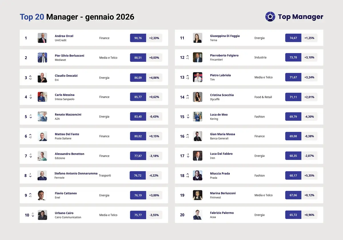 Top Manager Reputation, a gennaio in vetta l’ad di UniCredit Andrea Orcel