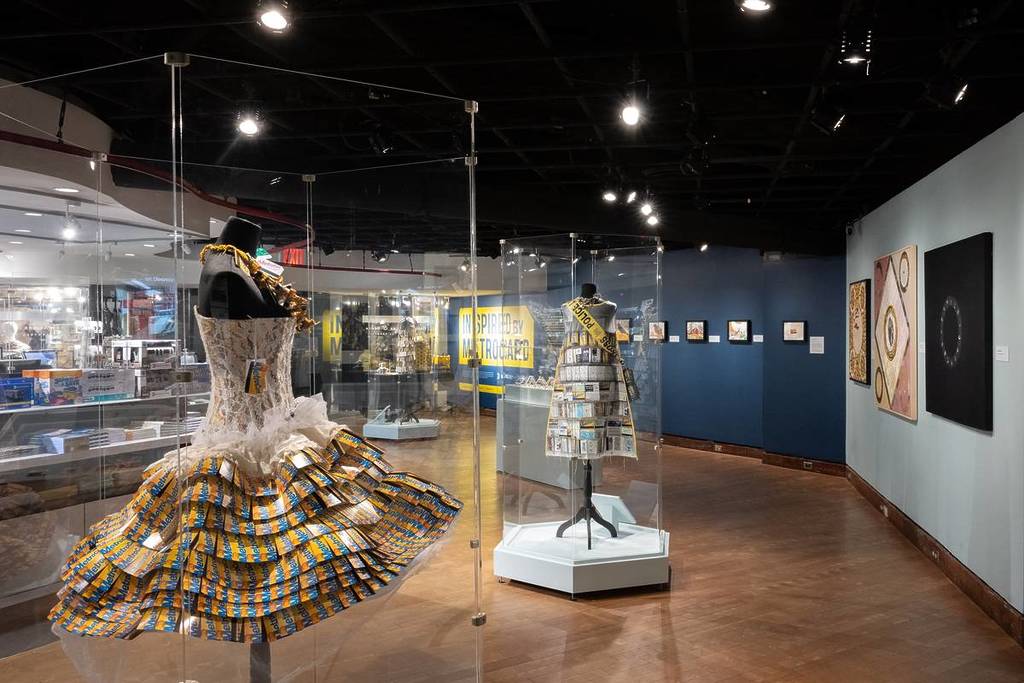 Le opere in mostra coprono ambiti molto diversi, ma condividono un elemento: partono tutte da un oggetto standardizzato e lo riconfigurano. L’artista Nina Vishneva, con il progetto MetroDress, utilizza centinaia di carte per realizzare abiti, tra cui un vestito da sposa e uno da ballo costruiti interamente con plastica riciclata. Nina Boesch lavora invece per sottrazione e ricomposizione, ritagliando le tessere per creare mosaici dettagliati che raffigurano skyline, ponti e animali urbani. VH McKenzie usa la superficie della MetroCard come una tela in miniatura, dipingendo scene di strada; Thomas McKean costruisce modelli architettonici ispirati ai palazzi newyorkesi. Tra i pezzi esposti compaiono anche le cosiddette “Hype Cards” progettate da Barbara Kruger per la Performa Biennial 2017, esempio di come la tessera sia stata utilizzata anche in contesti istituzionali e non solo spontanei.